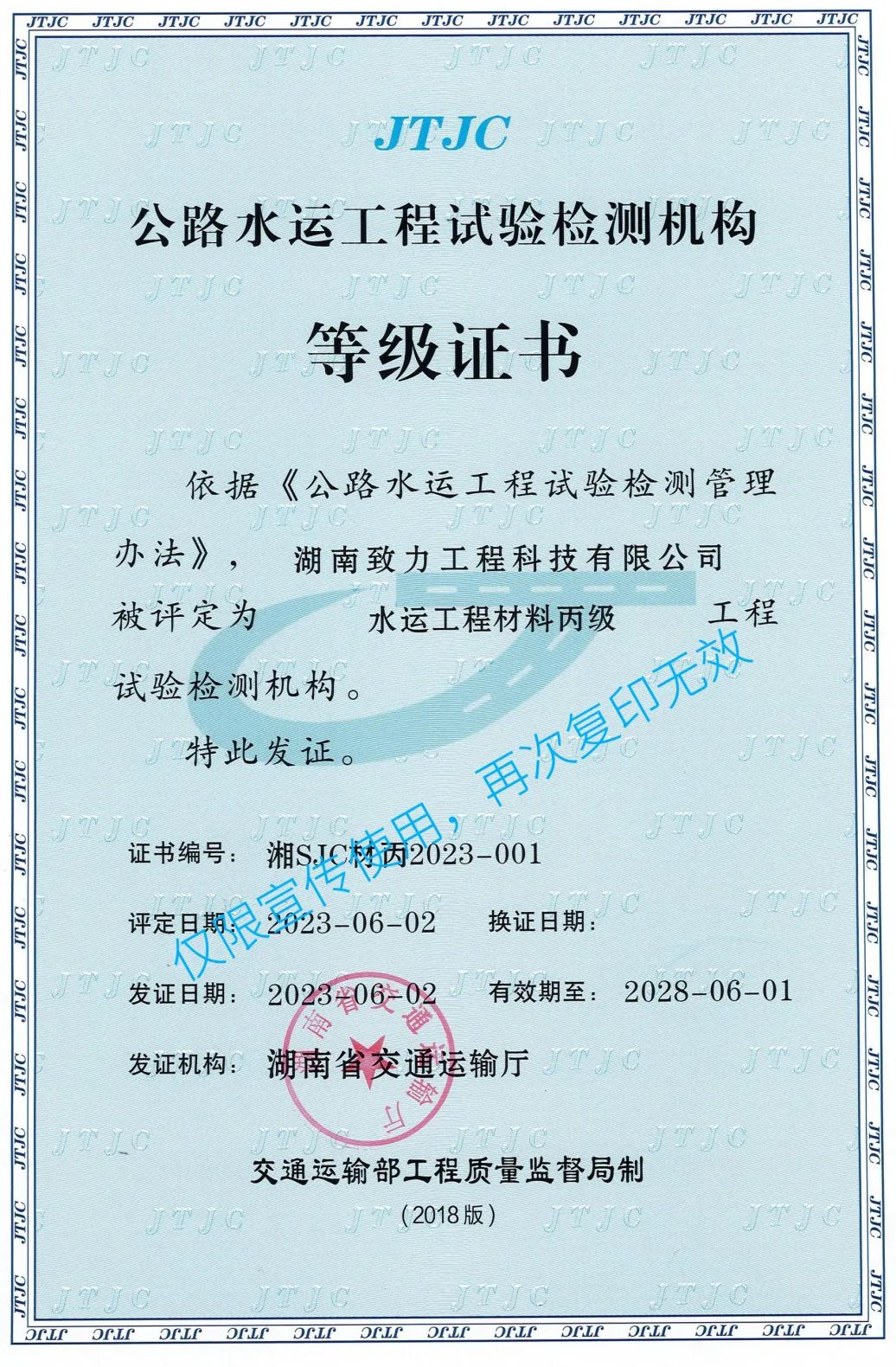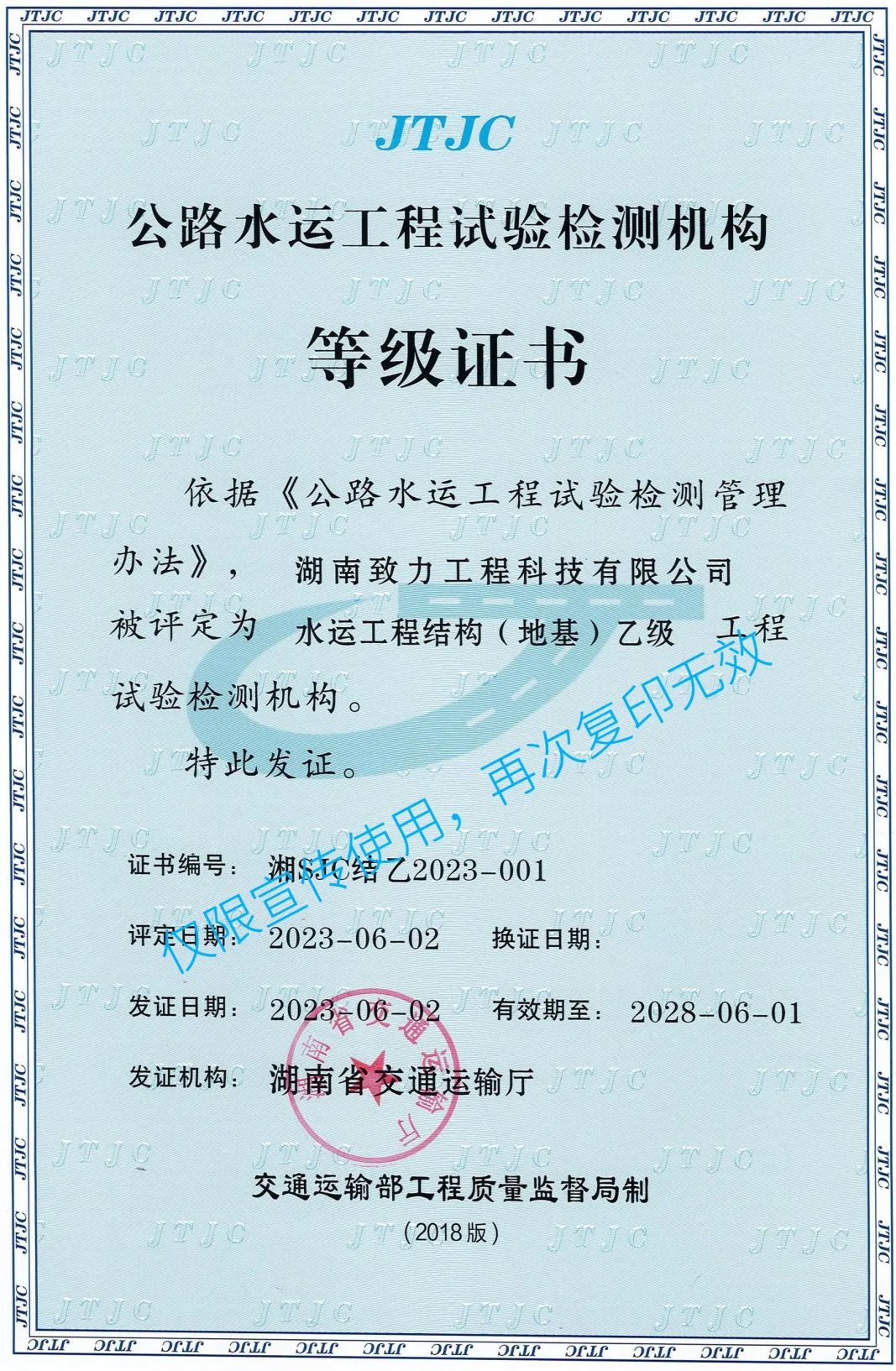 近日,經(jīng)湖南省交通運(yùn)輸廳審核,湖南致力工程科技有限公司順利獲批水運(yùn)工程結(jié)構(gòu)(地基)乙級(jí)資質(zhì)、水運(yùn)工程材料丙級(jí)資質(zhì)。兩項(xiàng)資質(zhì)的同時(shí)獲批,意味著公司業(yè)務(wù)領(lǐng)域取得新的突破,為進(jìn)一步拓寬公司業(yè)務(wù)范圍,提高市場(chǎng)競(jìng)爭(zhēng)力,更好地服務(wù)公路水運(yùn)工程試驗(yàn)檢測(cè)奠定了堅(jiān)實(shí)基礎(chǔ)。
