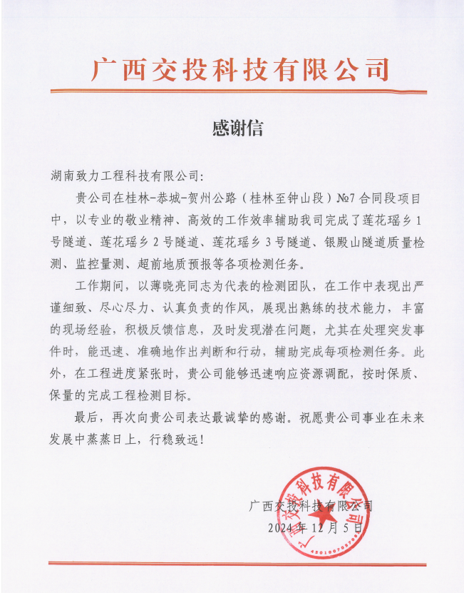 NEWS近日,湖南致力工程科技有限公司隧道檢測駐地項目部接連收到2封感謝信!信中指出,致力科技團(tuán)隊專業(yè)技術(shù)精湛、經(jīng)驗豐富,工作中秉持嚴(yán)謹(jǐn)細(xì)致、認(rèn)真負(fù)責(zé)的態(tài)度,能準(zhǔn)確且高效地完成隧道質(zhì)量檢測、監(jiān)控量測、超前地質(zhì)預(yù)報等各類工作任務(wù)。